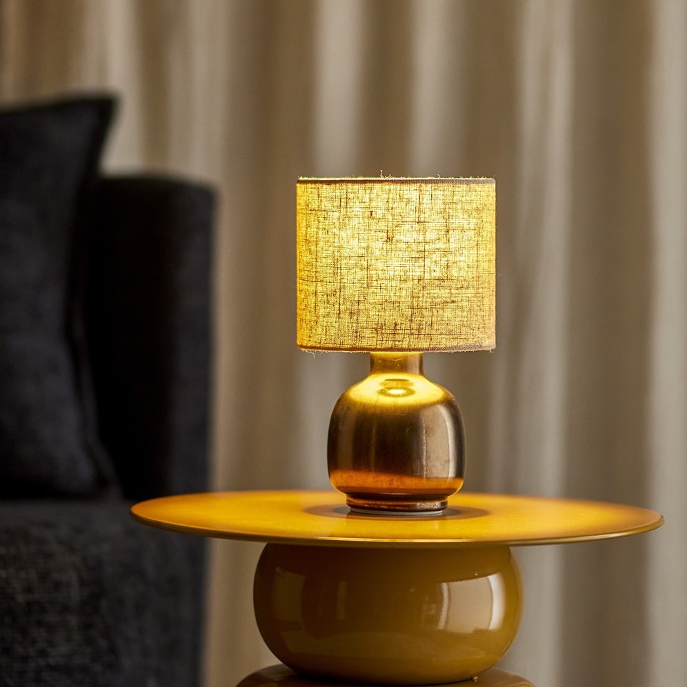 Agni bordlampen fra Bloomingville er fremstillet i stentøj med en smuk metallisk glasur og en let tekstureret, afrundet fod. Den beige lampeskærm i hør har et diskret vævemønster, som giver et blødt og behageligt lys. Samspillet mellem materialer og varme toner gør lampen nem at passe ind i mange indretningsstile.
