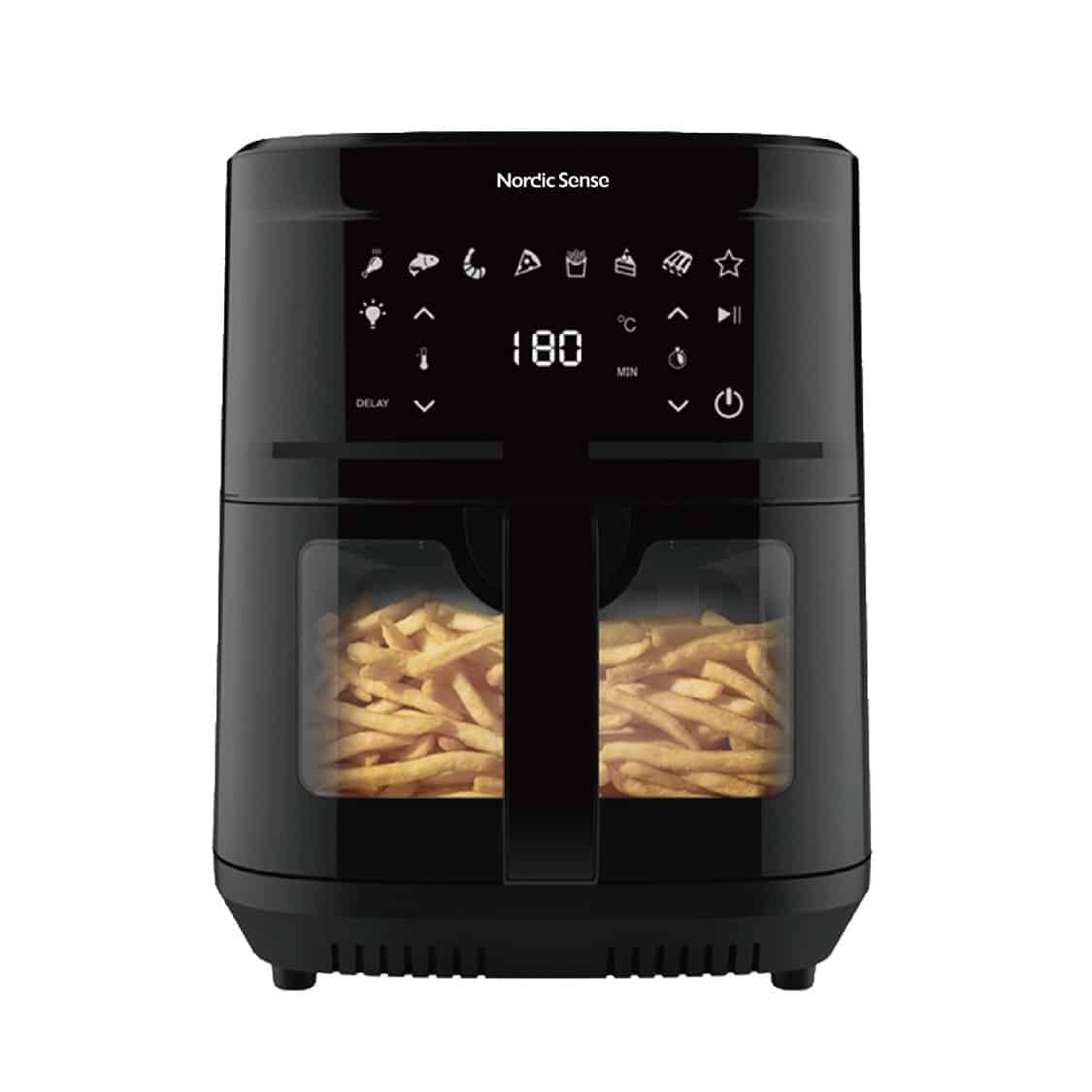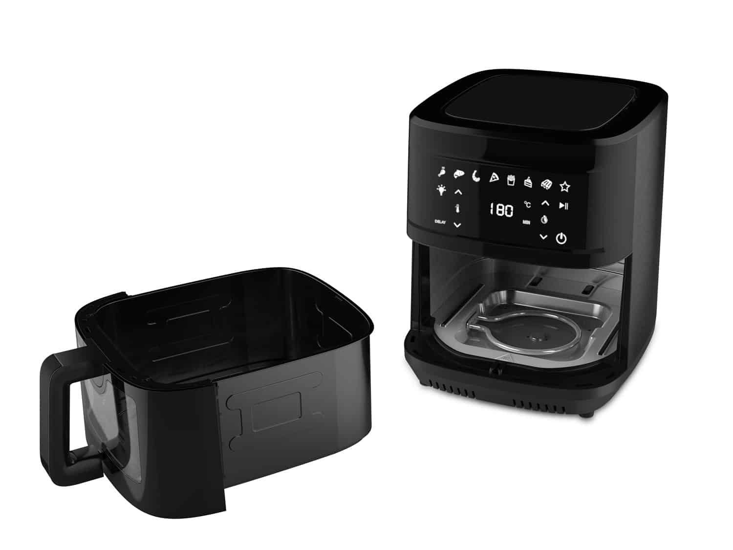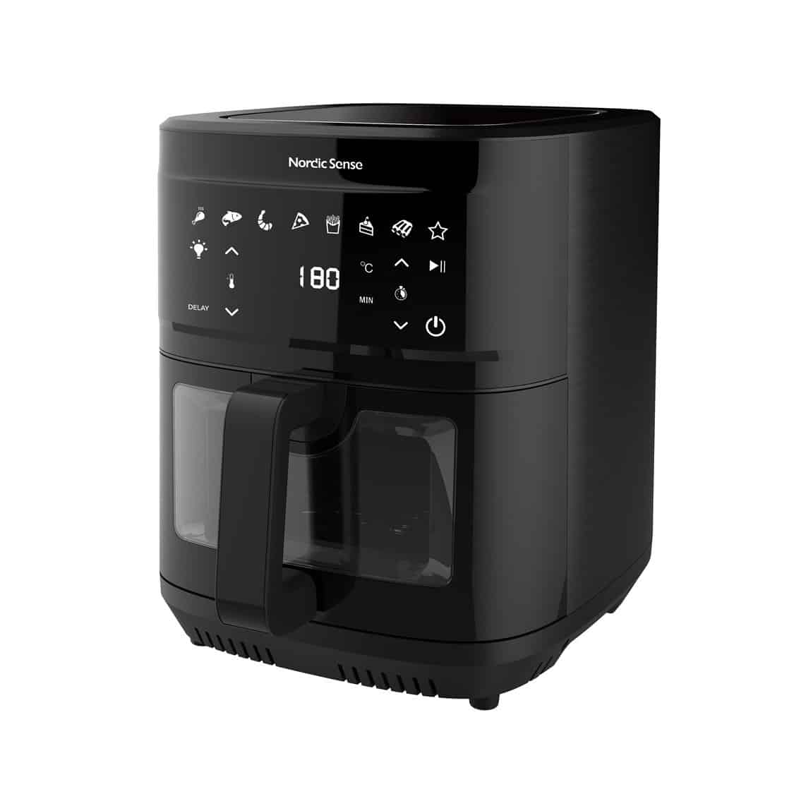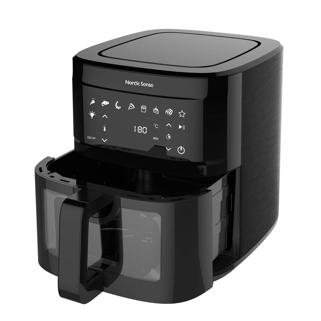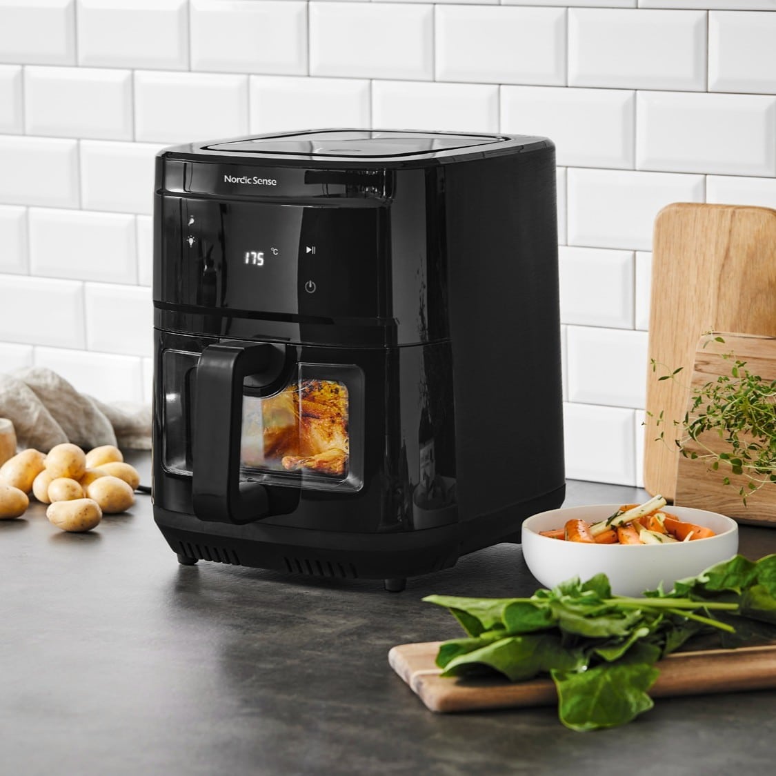 Med hele 9 liter kapacitet er denne airfryer ideel til store portioner og sundere madlavning med mindre fedt. Temperaturen kan justeres fra 80 til 200 °C, og med timer op til 60 minutter har du fuld kontrol – uanset om du laver sprøde pommes frites eller saftig kylling. Top- og bundvarme sikrer jævn tilberedning, og det praktiske vindue gør det nemt at følge maden undervejs.