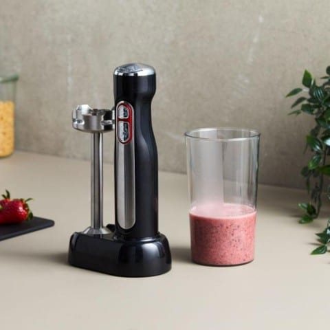 Stavblenderen leveres med 700 ml bæger, oplader og holder til tilbehør – alt sammen i BPA-frie materialer.
