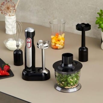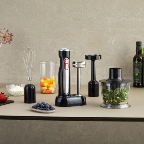 Med det tilhørende ekstradele-sæt får du endnu flere muligheder i madlavningen. Pisk luftigt flødeskum eller æggehvider med piskeriset, lav cremet grøntsagsmos med moseskiven, eller hak urter, nødder og grøntsager i den kompakte minihakker – perfekt til pesto, salsa og dip.