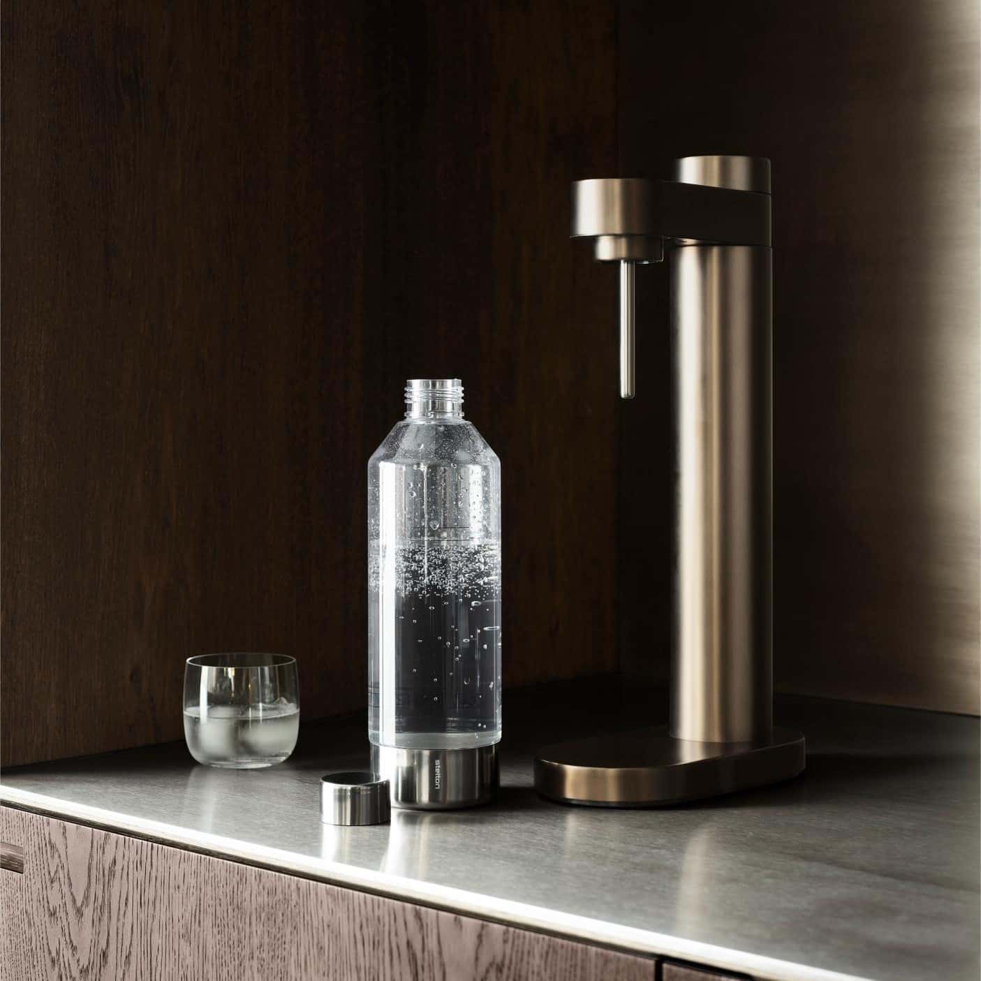 Designet er skabt af den danske designer Søren Refsgaard, kendt for sit enkle og funktionelle formsprog. Her er alt overflødigt skåret væk, så resultatet står knivskarpt og elegant. De klassiske, cylindriske former – et kendetegn for Stelton – går igen i både den ultraslanke beholder til kulsyrepatronen og den intuitive kulsyreknap. Med et enkelt drej tilpasser du mængden af kulsyre efter din smag, og med et modsat drej løsner du flasken igen.