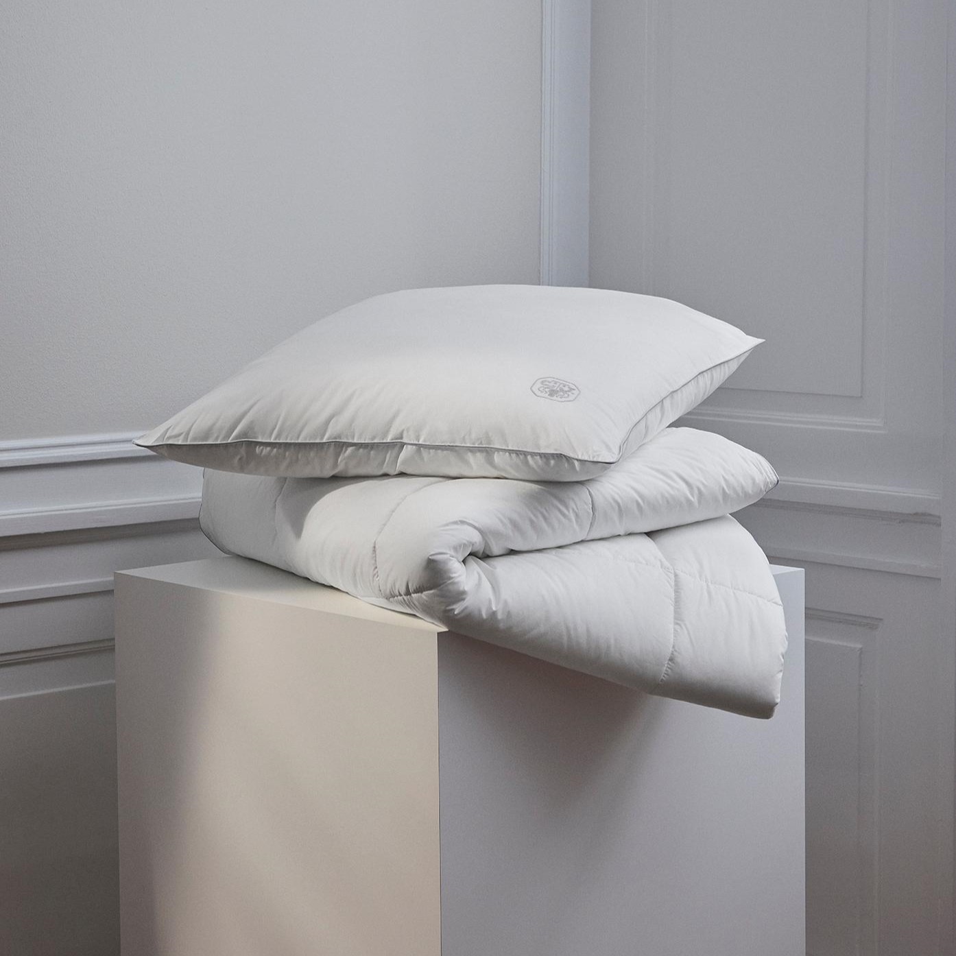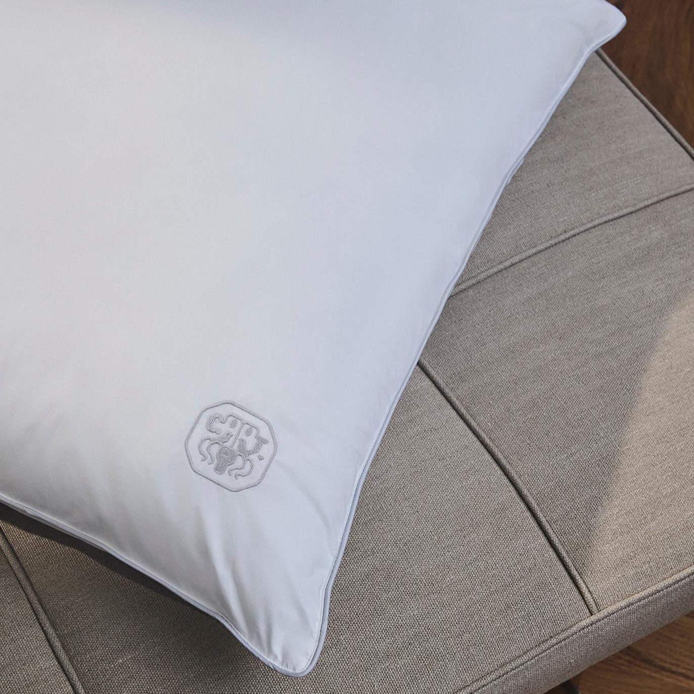 For at give optimal komfort og støtte har puderne tre separate kamre. Puden bærer Georg Jensen Damasks ikoniske logo som et diskret broderi – et symbol på kvalitet og omhyggelighed.